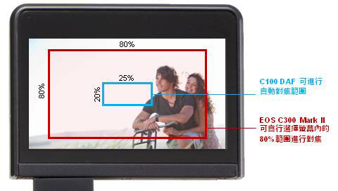 >EOS C300 Mark II內置雙像素CMOS自動對焦系統,採用全新結構的CMOS影像感應器,能同時進行感光及相位檢測自動對焦功能,當配合佳能全線EF鏡頭1使用時,能實現流暢的連續自動對焦功能,用家更可自行選擇螢幕內的80%範圍進行對焦,覆蓋大部分畫面,為4K攝錄帶來更精準銳利的對焦表現。顯示器上更會顯示對焦輔助資訊,明確指出對焦位置於合焦前後的狀態,助用家更輕易取得準確對焦。攝錄機更可配合EF鏡頭使用臉孔追蹤自動對焦功能,確保時刻對準移動中的人物主體。 |