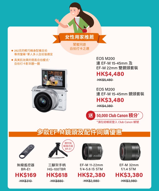 適合一眾喜愛自拍用家的EOS M200輕巧4K無反相機,採用輕巧纖薄設計,配備上揭式自拍螢幕、簡潔易用的圖像界面及具備平滑肌膚效果的自拍模式,雙像素CMOS自動對焦新加入眼睛偵測自動對焦,亦加入4K攝錄及方便於智能手機上瀏覽的垂直短片攝錄功能。