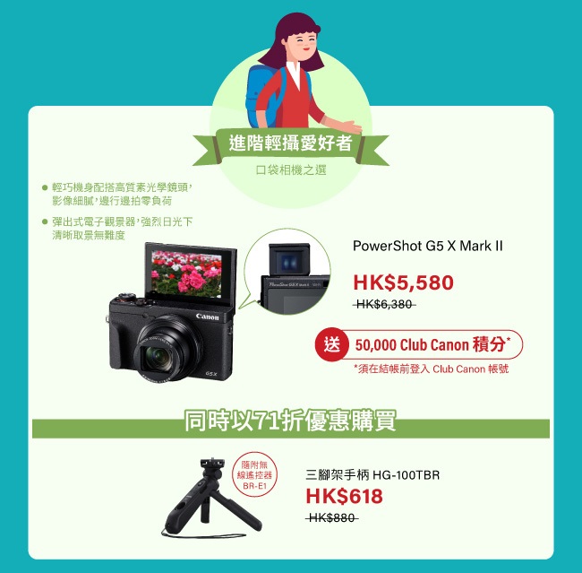 PowerShot G5 X Mark II 數碼輕便相機是專為進階攝影愛好者而設的最佳口袋相機之選,配備24-120mm f/1.8-2.8特大光圏5倍光學變焦鏡頭 、每秒30張超高速RAW連拍 及彈出式電子觀景器,帶來方便易用的操作體驗及高影像質素。